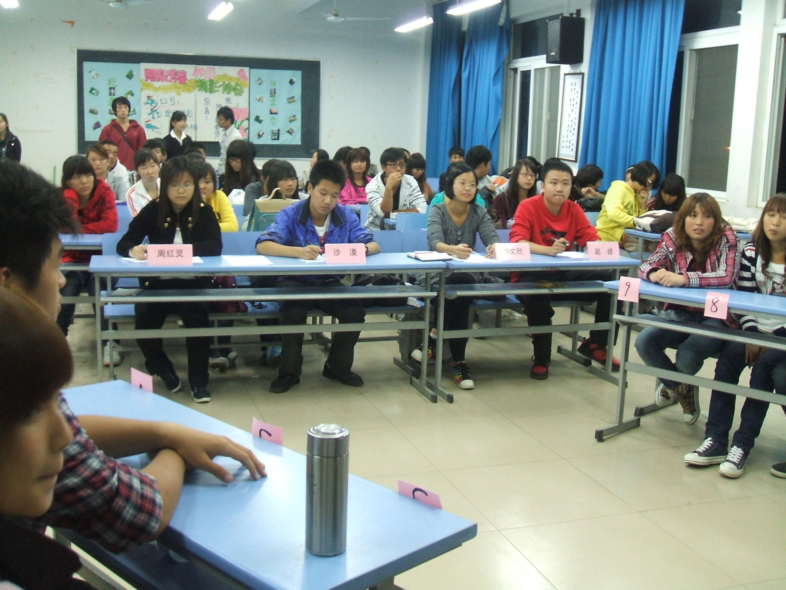本次比赛本着公开、公平、求知、求实、求精的原则,比赛分两个环节:一是现场答题,二是展示班级风采。首先是赛前准备:赛场布置已分给各班负责,包括赛场桌椅摆放及黑板报设计。学习部邀请了十位主持人,每个赛场两名主持人,每个赛场有两个班级,六名选手。参加此次活动的共有33名选手,共11个班级、5个赛场,每个赛场中亲友团将近一百人。