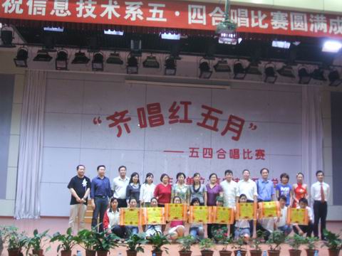 经过赛前同学们紧张而充分地准备,合唱比赛顺利进行。以班为单位的14支参赛队伍分别演唱了两首歌曲,其中《中国共青团团歌》为公共曲目。比赛期间同学们精神昂扬,嘹亮的歌声,别出心裁的服装设计和舞台造型赢得了台下观众的阵阵掌声。深情款款的《心愿》,令人耳目一新的《女兵谣》一次次将会场气氛推向高潮。比赛结束后评委老师对各参赛队伍做了简单的点评,同学们的精彩表演得到了评委们的一致好评。最后,08现教班凭借着青春靓丽的造型,激情四射的演唱夺得此次比赛桂冠。