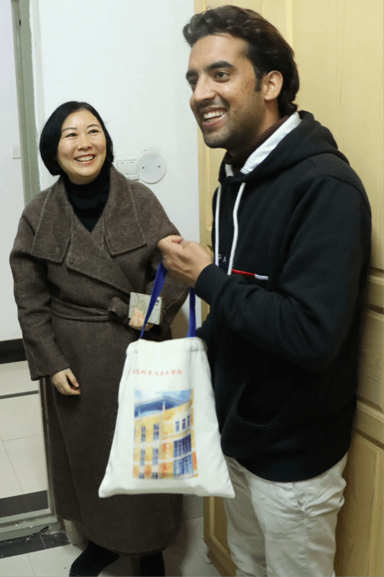 学院团总支还贴心的为Riaz Khan(里亚兹·汗)送上“学院专属暖心包”,内含签字笔、笔记本及雨伞等学习生活用品,搭配印有学院标识的专属提包,实用又传递关怀。