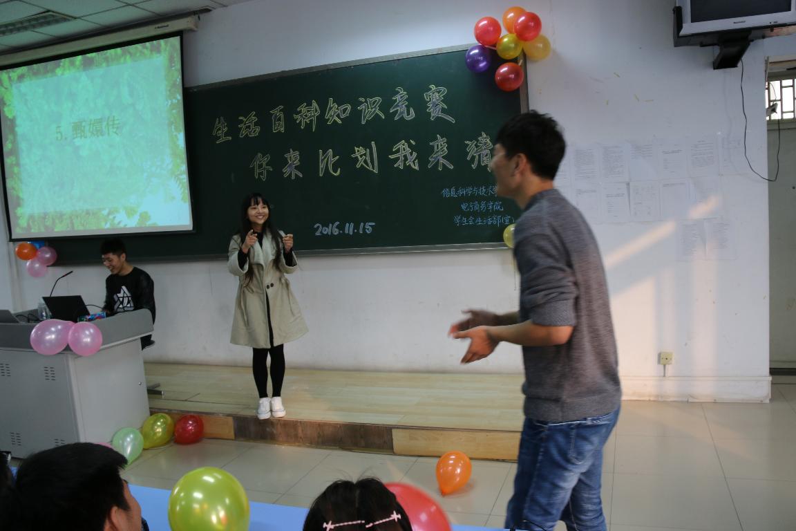 下午2:30,活动正式开始。活动开始前,首先进行的是生活百科知识竞赛,竞赛分必答题和抢答题两个环节,同学们劲头十足的参与答题并取得了不错的成绩。接着进行了你来比划我来猜游戏,在限定的两分钟时间内,参赛选手两两一组,一人比划,一人来猜,场面紧张而愉悦,每选手答对题目时,现场评委及观众就报以热烈的掌声祝贺。最后,现场公平公正公开的评选出了竞赛和游戏的奖项,由主席郑浩然,副主席陈正一,生活部部长孙寅婷给获奖者现场颁发奖品并拍照留念。活动结束后,同学们有序退场。