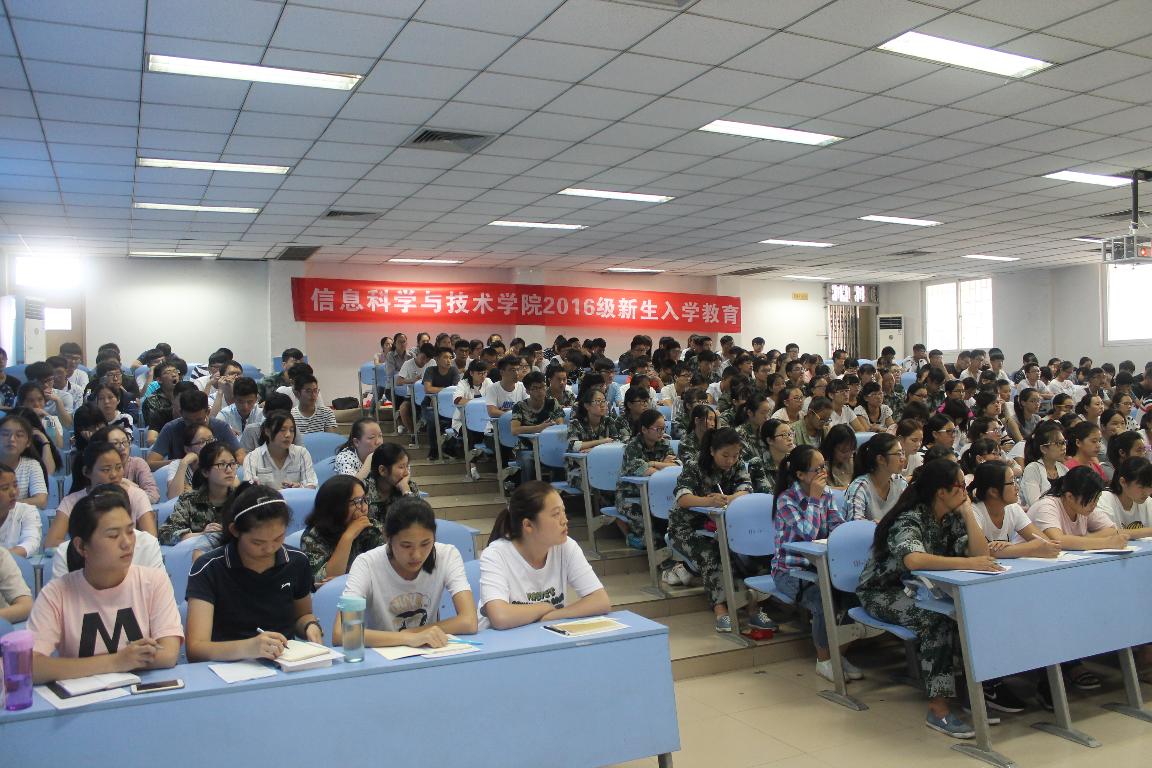 2016年9月13日下午2:30,信息科学与技术学院2016级新生“院长第一课”暨专业思想教育西校区一号楼一阶三顺利举行。院长胡明生、各系主任、团总支书记、辅导员出席此次教育活动,2016级全体新生参加了此次会议,会议由团总支书记主持。