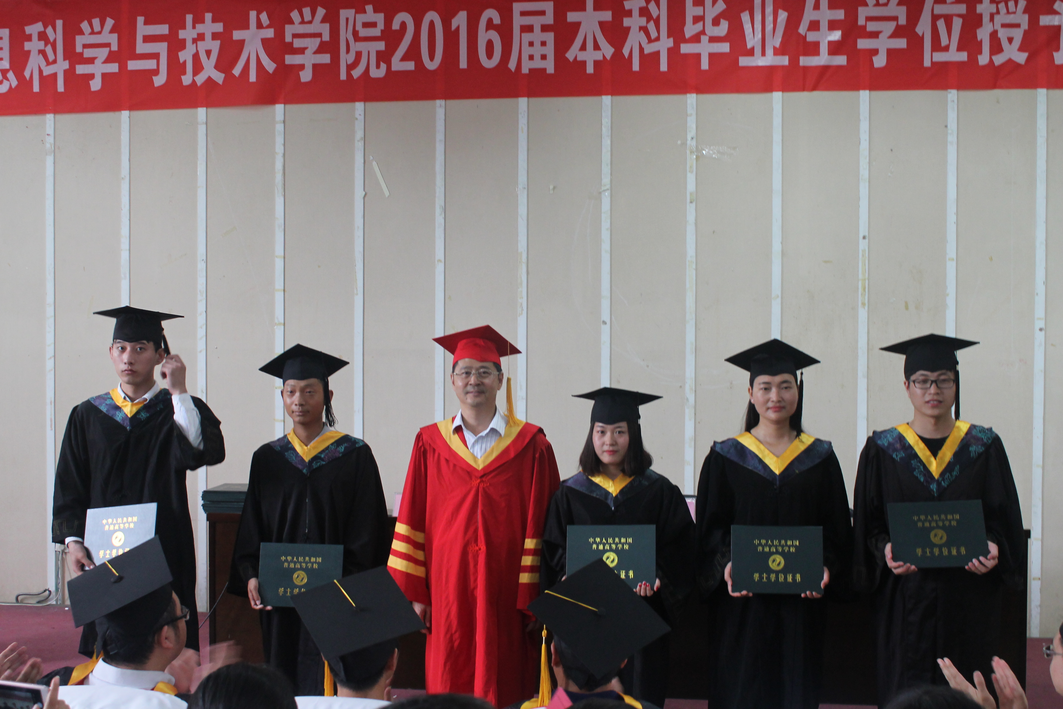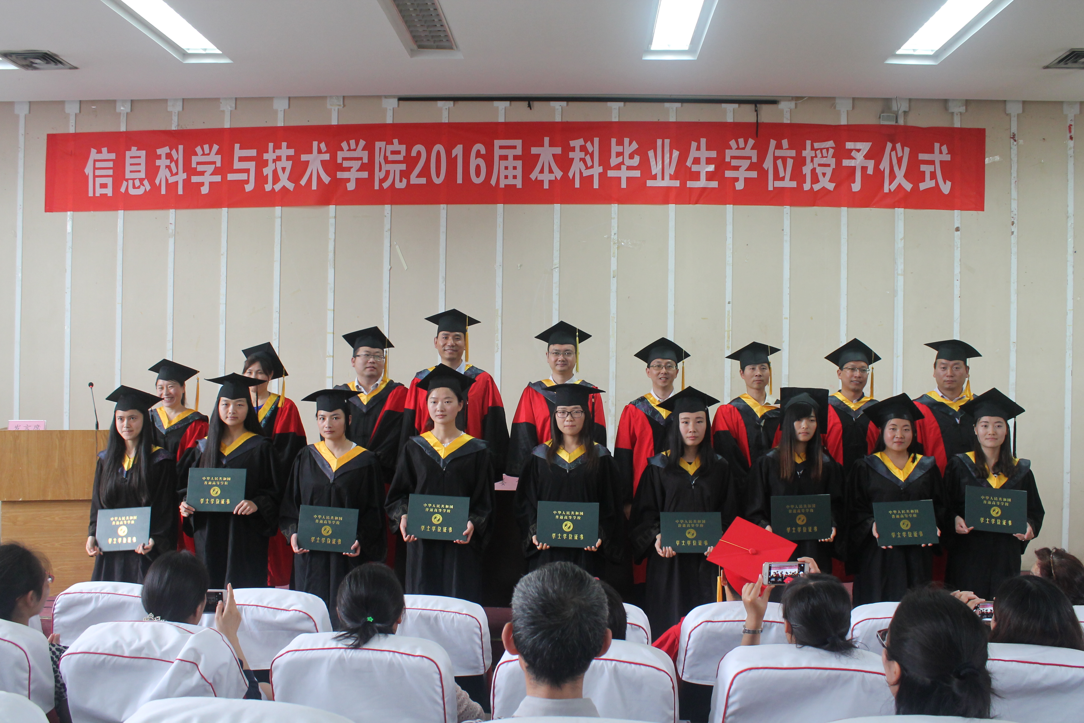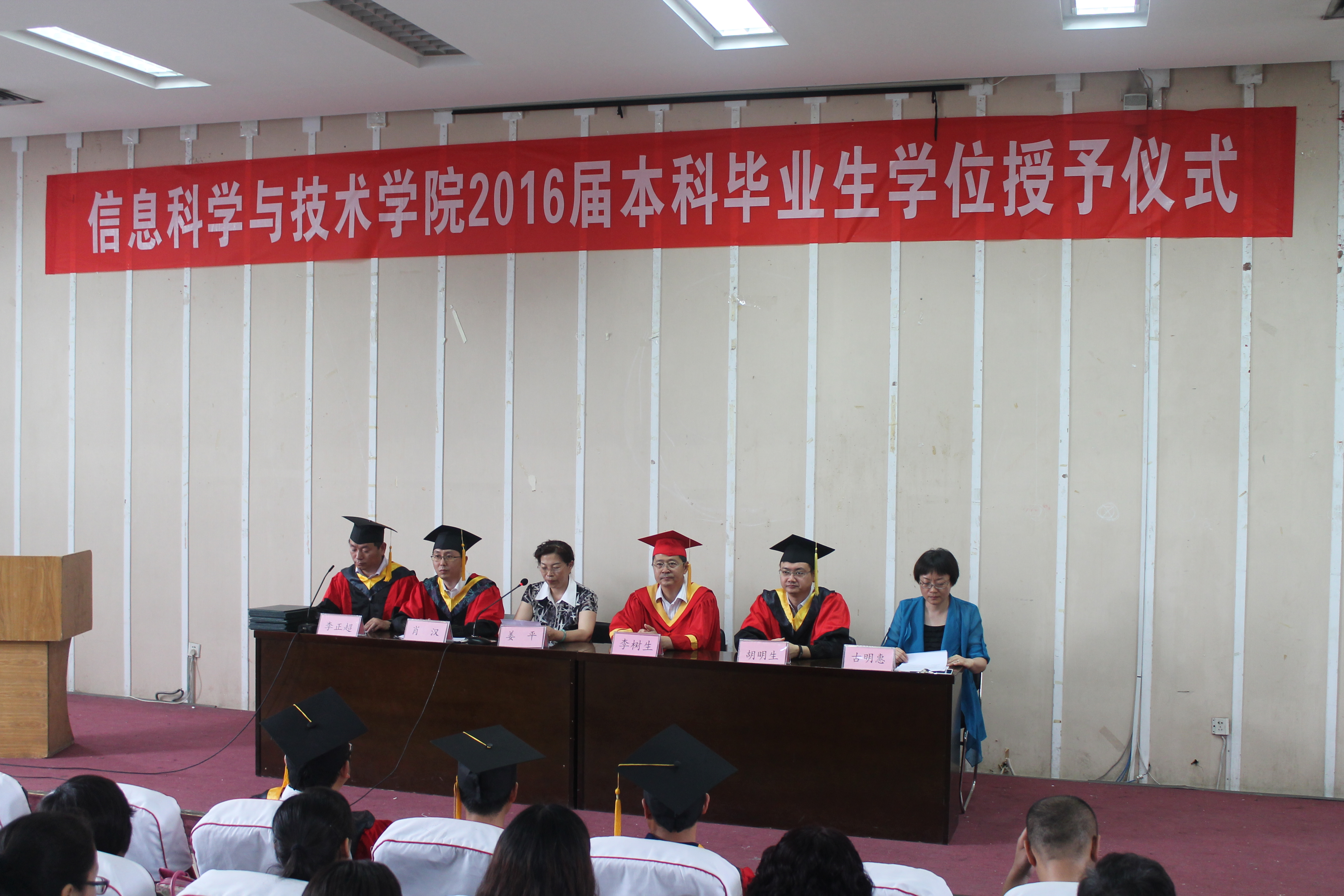 2016年,信息科学与技术学院共有134名同学被授予学士学位。典礼仪式上,古明惠副书记宣读优秀毕业生和优秀毕业设计学生名单,肖汉副院长宣读学位评定委员会授予学位的决议。计算机科学系主任贾遂民教授和温庆同学分别代表导师和毕业生发言。