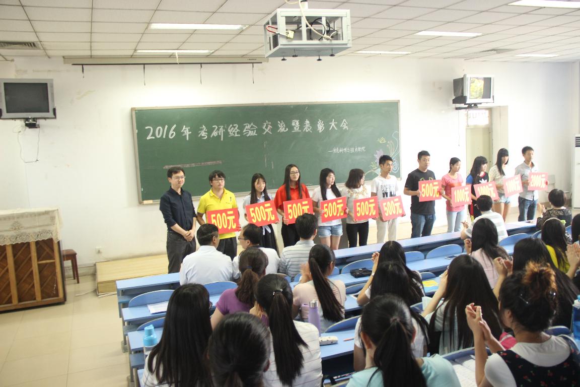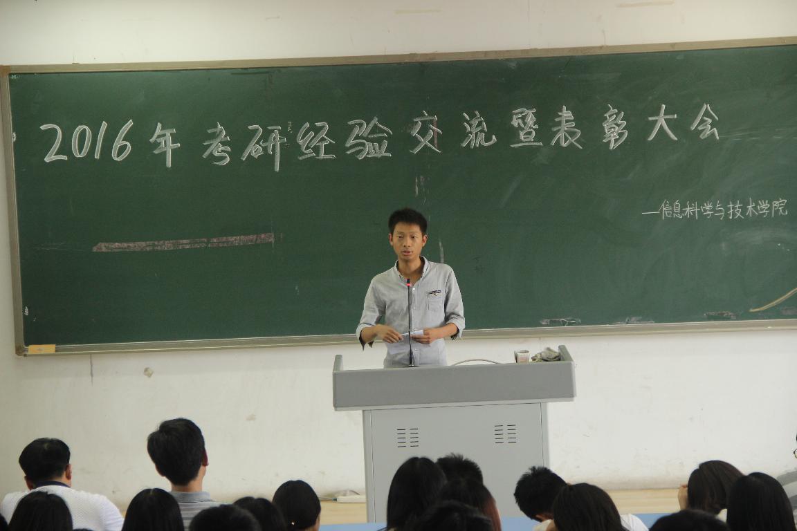 会上古书记宣读了《信息科学与技术学院2016年考研表彰决定》,胡院长为2016级考研优秀学子颁发了奖牌,优秀考研学生代表温庆、余冬雪分别上台作典型发言,并分享了自己的考研心得体会,李副院长作了总结讲话,并鼓励大家积极考研。在随后的经验交流环节上,同学们从考研信息获取渠道、考研时间安排、和考研学校专业选择等方面向学长学姐们进行了询问,学长学姐们热情耐心地进行解答,并最后留下自己的联系方式以便同学们会后继续交流,至此,信息科学与技术学院2016年考研经验交流暨表彰大会圆满结束。