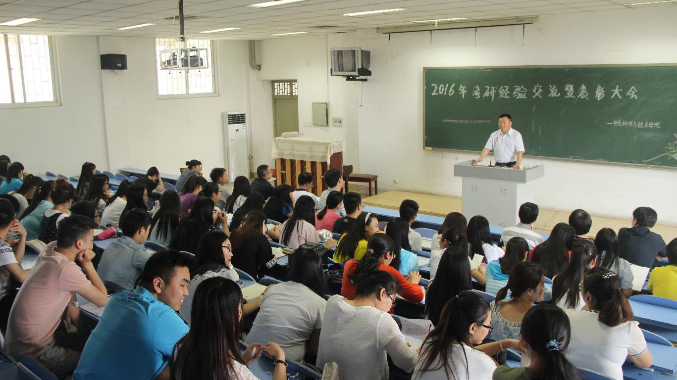 为表彰先进,交流经验,鼓励我院本科毕业生积极考取研究生,不断推进学院优良学风建设,5月24日下午14:00,信息科学与技术学院2016年考研经验交流暨表彰大会在西校区一阶三教室成功举办。莅临此次大会的领导有信息科学与技术学院院长胡明生、党总支副书记古明惠、副院长肖汉、副院长李正超、各系主任、团总支书记、辅导员代表及教师代表。2016届考研录取学生、2013、2014级考研意向同学参加了会议。会议由团总支书记主持。
