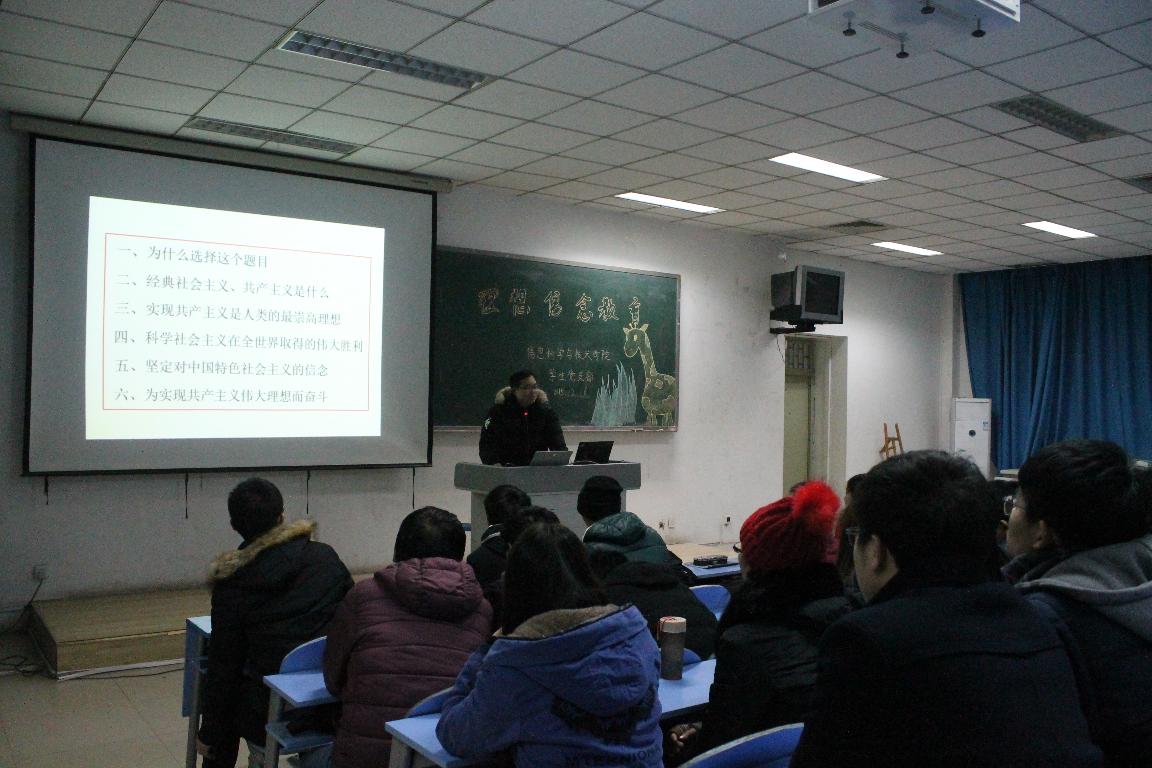 接下来学生党支部书记余奇明以;坚定中国特色社会主义信念,为实现共产主义理想而奋斗;为主题对同学们进行理想信念教育。从为什么选择这个题目;经典社会主义、共产主义是什么;实现共产主义是人类的最崇高理想;科学社会主义在全世界取得的伟大胜利;坚定对中国特色社会主义的信念;为实现共产主义伟大理想而奋斗;等六个方面向同学们阐述身为共产党员要坚定信念,为实现共产主义理想努力奋斗终生。