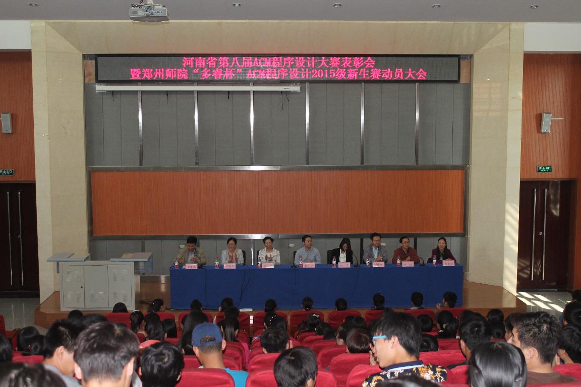 2015年10月13日下午,郑州师院“多睿杯”ACM程序设计2015级新生赛动员大会在东校区综合教学楼学术报告厅隆重举行。参加大会的有:教务处张广华副处长、姜平书记、胡明生院长、古明惠副书记、肖汉副院长、郑州师院ACM-ICPC总教练贾志娟教授及C语言课程任课教师、河南省第八届ACM程序设计大赛获奖学生和2015级全体本科新生,大会由计科系贾遂民主任主持。