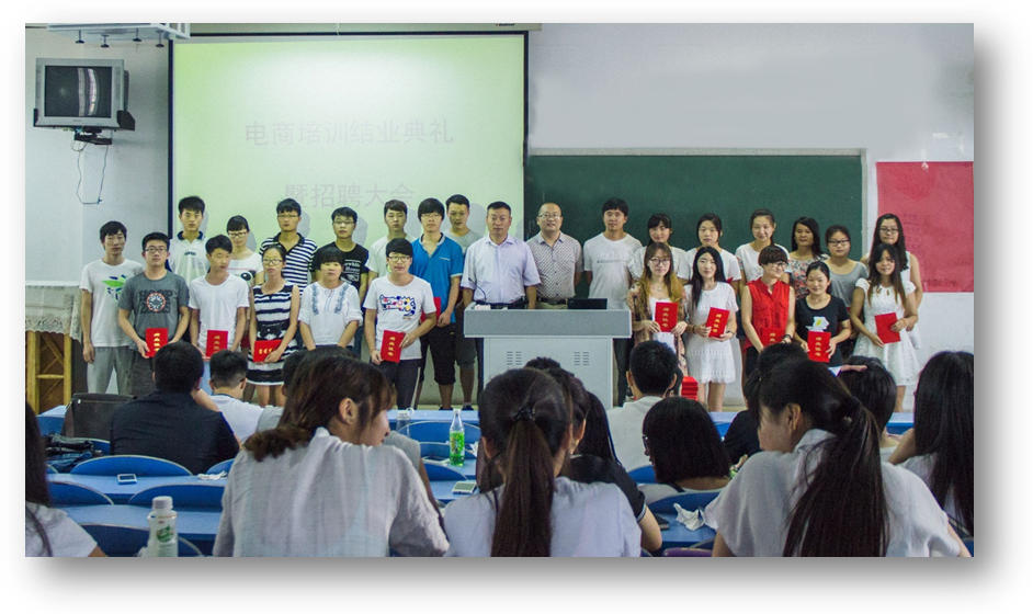2015年8月28日上午10时,我院在1号楼1阶3教室隆重召开电商结业典礼暨招聘大会。会上我院教育信息技术系主任李正超,电商学院办公室主任王永刚对整个培训做了全面的总结和分析,在学生就业方面鼓励学生参与社会实践,加强实战积累,与此同时并对优秀学生进行了颁奖仪式,还表示我院领导将对学生的结业后的后续发展给予最大的帮助。会上前来招聘的几家公司,进行了现场招聘,让郑州师范学院的电子商务人才与各公司企业的优势强强联手,从而实现共赢。