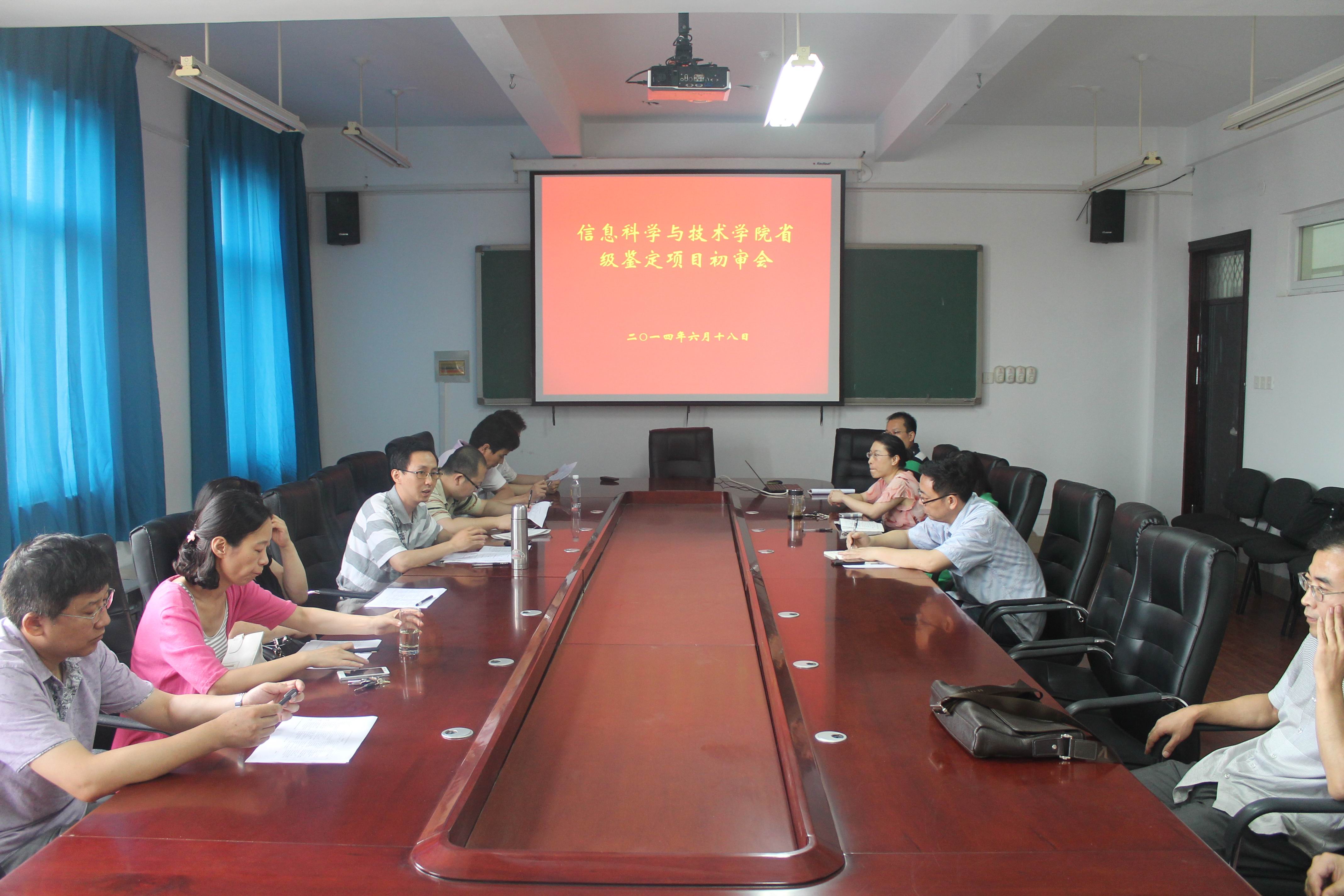 2014年6月18日信息科学与技术学院省级鉴定项目评审会在学院会议室顺利召开。肖汉副院长主持了评审会,我院贾志娟教授、贾遂民副教授、孟庆伟副教授、王永刚主任、杨丽霞副教授、李季副教授、徐红梅博士为评审会的评委。