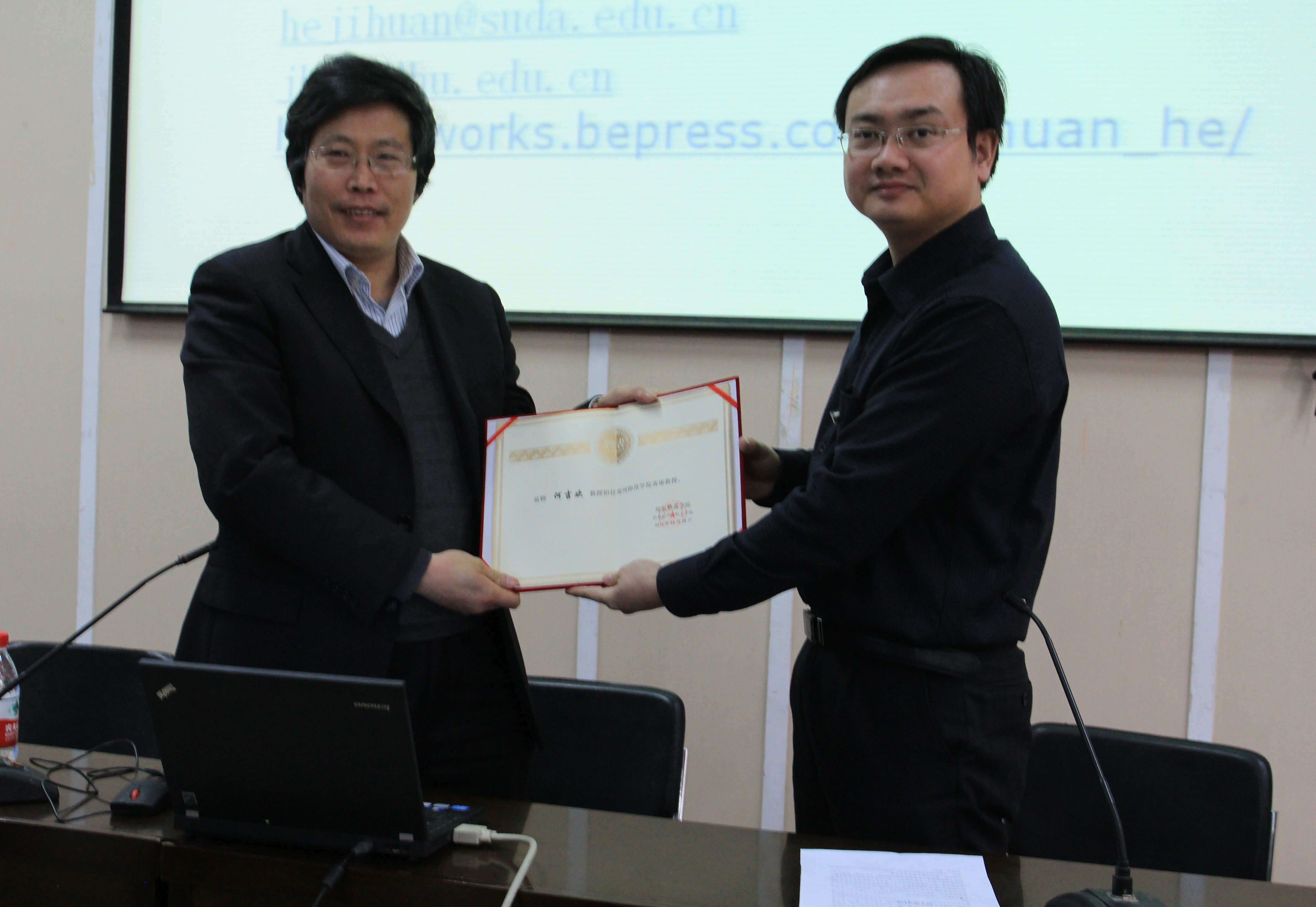胡明生院长、肖汉院长等院领导和部分教师、学生聆听了报告。我院聘请何吉欢教授为客座教授,胡院长为何教授颁发了聘任证书。