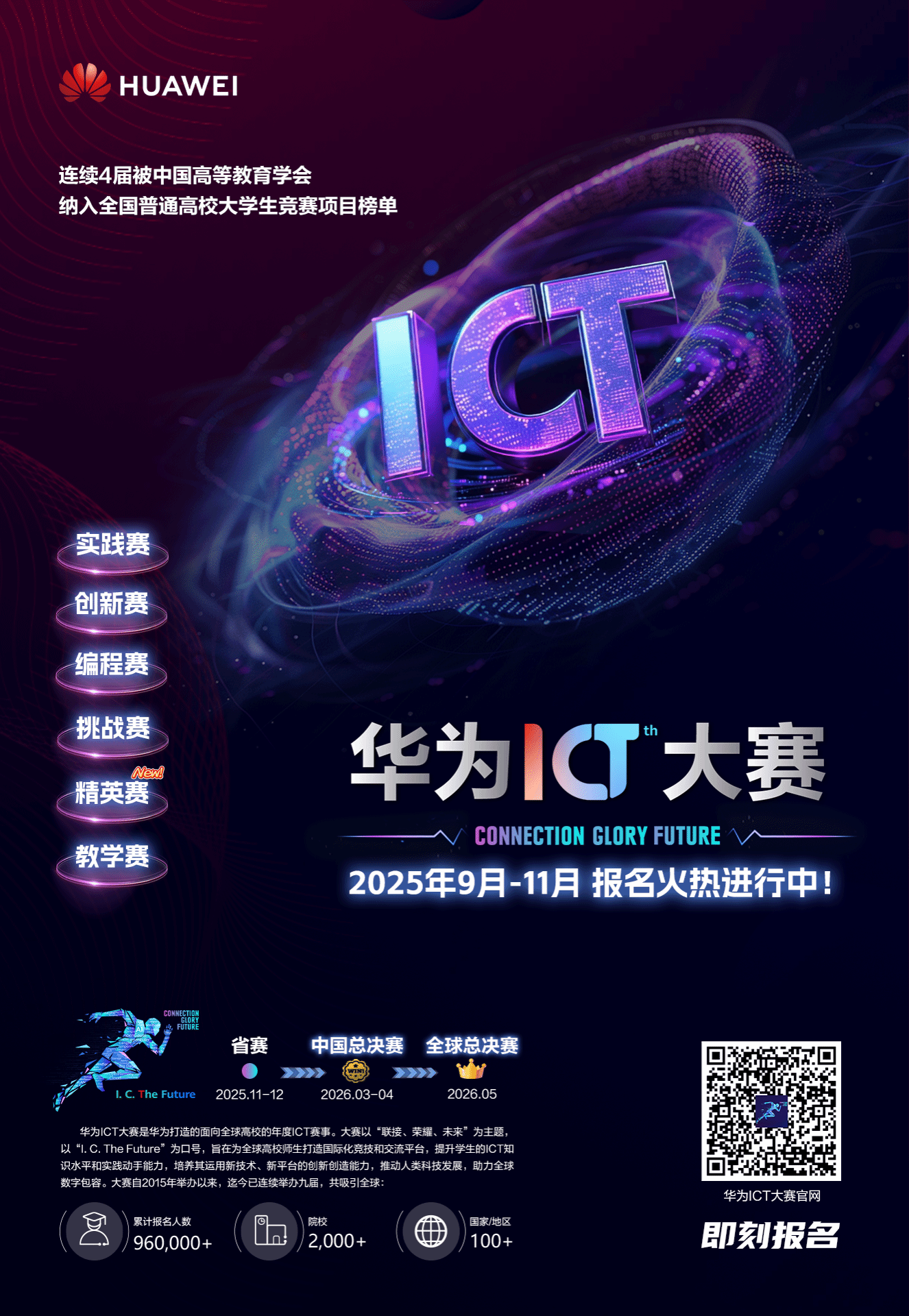 5)教学赛报名地址:https://e.huawei.com/cn/talent/#/ict/innovation-details?zoneCode=027425&zoneId=98269664&compId=85132010&divisionName=%E4%B8%AD%E5%9B%BD%E5%8C%BA&type=T104&isCollectGender=N&enrollmentDeadline=2025-11-30%2023%3A59%3A59&compTotalApplicantCount=11