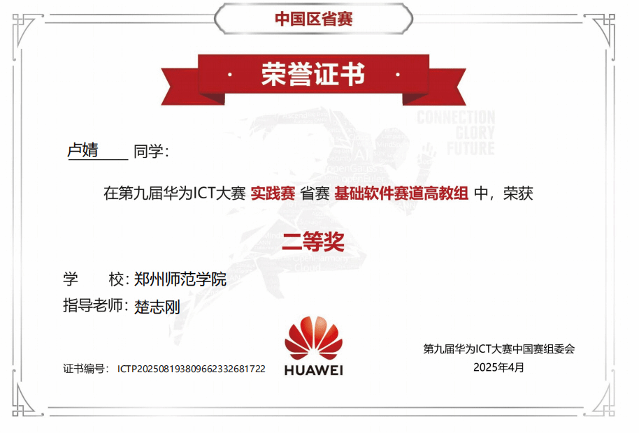 我院自2013年11月开展华为ICT学院建设以来,在广大师生的支持和积极参与下,发展迅速。我院教师参与华为师资培训5期12人次,获得证书10个,在华为人才在线开设openEuler、openGauss、AI、HarmonyOS等课程30余班。学生参与华为人才在线课程学习超过1000人,完成结课500余人,获得华为HCIA职业认证50余人,1人获得HCIP认证,获得华为开发者认证70余人。参加第九届华为ICT大赛近100人,获得省赛一等奖1人,二等奖1人,三等奖2人。