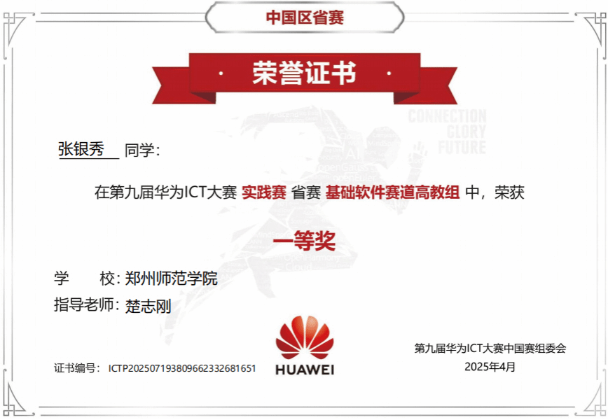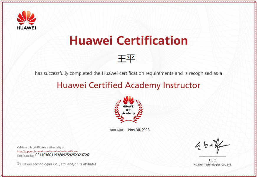 我院自2013年11月开展华为ICT学院建设以来,在广大师生的支持和积极参与下,发展迅速。我院教师参与华为师资培训5期12人次,获得证书10个,在华为人才在线开设openEuler、openGauss、AI、HarmonyOS等课程30余班。学生参与华为人才在线课程学习超过1000人,完成结课500余人,获得华为HCIA职业认证50余人,1人获得HCIP认证,获得华为开发者认证70余人。参加第九届华为ICT大赛近100人,获得省赛一等奖1人,二等奖1人,三等奖2人。
