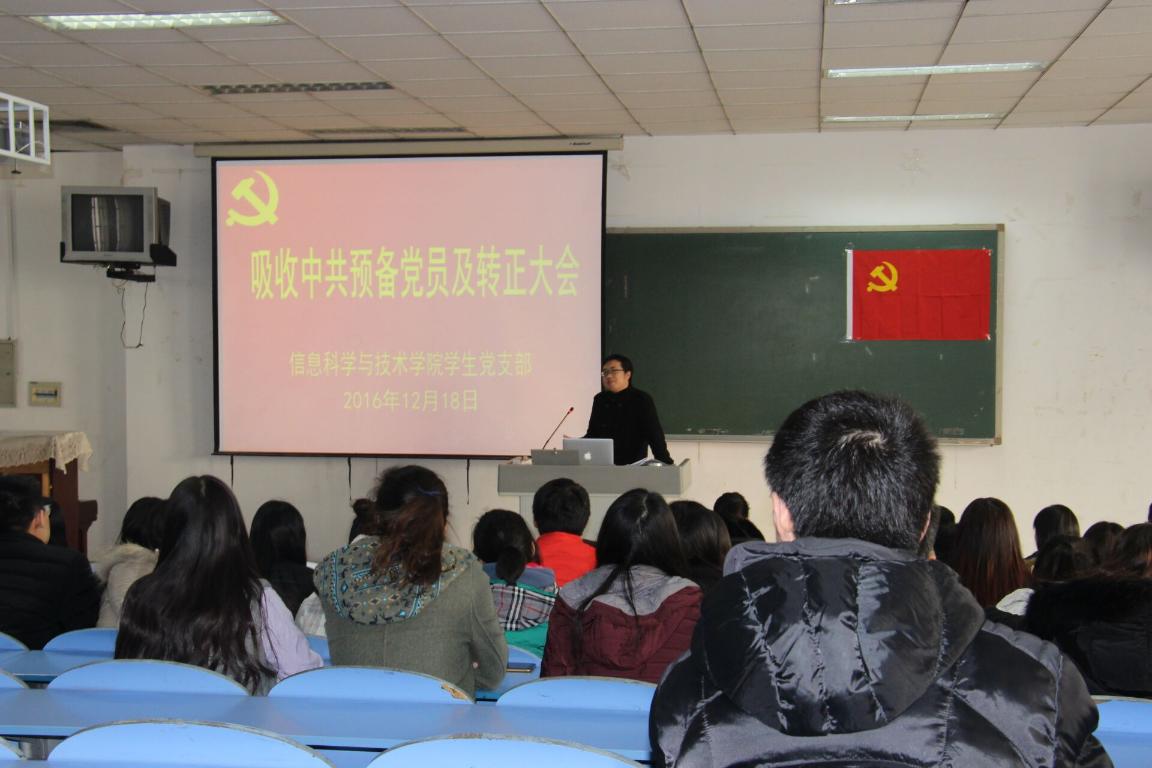 2016年12月18日下午,信息科学与技术学院学生党支部在西校区1号楼一阶三召开了接收预备党员及预备党员转正大会。信息科学与技术学院学生党支部全体党员参加了本次大会。大会由信息科学与技术学院学生党支部书记余奇明主持。