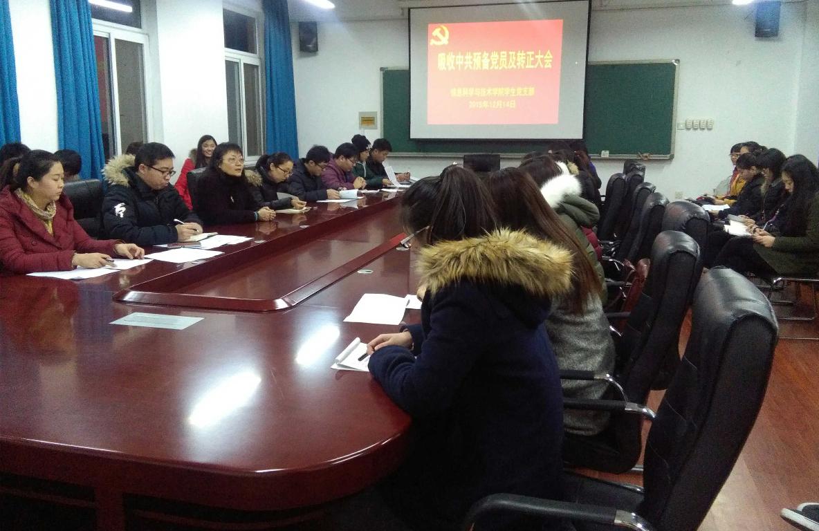 2015年12月14日晚18:00,信息科学与技术学院学生党支部在西校区一号楼1505会议室隆重召开了预备党员转正暨接收预备党员大会。我院党总支副书记古明惠、学生党支部书记余奇明、学生党支部组织委员张真、宣传委员刘笑寒、李天顺、闵照刚等老师与全体学生党员、预备党员、党员发展对象参加了此次会议。