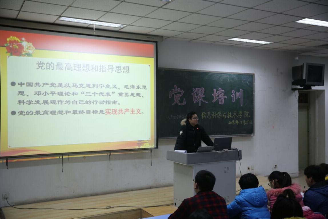 2015年11月25日晚,信息科学与技术学院入党积极分子及发展对象培训课在西校区一号楼一阶三进行,此次培训由团总支书记余奇明主讲。